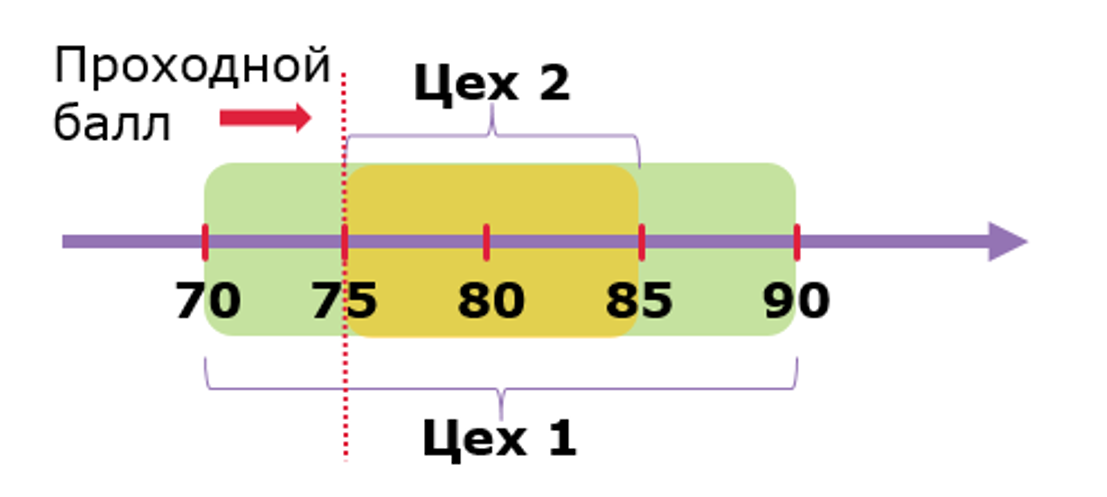 Предположим, у нас есть проходной балл аттестации – 75. Давайте посмотрим, в каком цехе больше рабочих, набравших проходной балл и прошедших аттестацию?