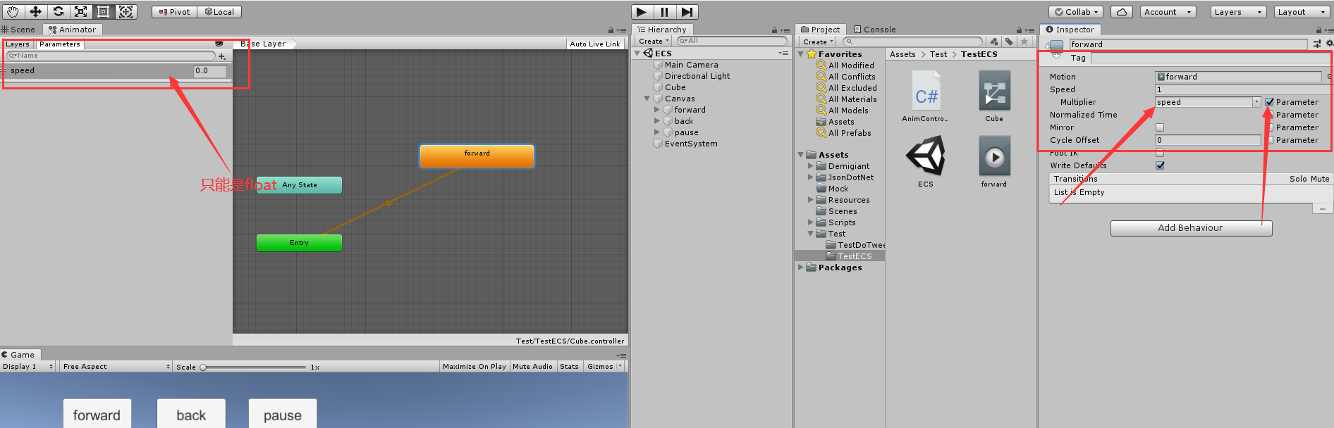 using System.Collections; using System.Collections.Generic; using UnityEngine; public class AnimController : MonoBehaviour < public Animator ani; private void Start() < ani.SetFloat("speed", 0); >/// /// Скорость прямой трансляции 1 /// public void OnClickForward() < ani.SetFloat("speed", 1.0f); >/// /// тайм-аут /// public void OnClickPause() < ani.SetFloat("speed", 0); >/// /// Скорость перемотки 1 /// public void OnClickBack() < // Скорость перемотки 1 //ani.SetFloat("speed ", -5.0f); Скорость обратного воспроизведения 5 ani.SetFloat("speed", -1.0f); >>