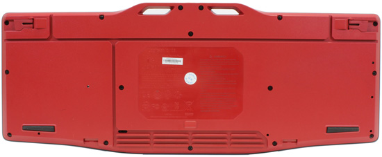 Однако строгой сделана в первую очередь верхняя сторона, а если перевернуть девайс «вверх тормашками» — мы увидим, что днище выглядит необычно, оно полностью окрашено в красный цвет. Тут располагаются две складные «лапки», а также специальные противоскользящие накладки, сделанные из резины.