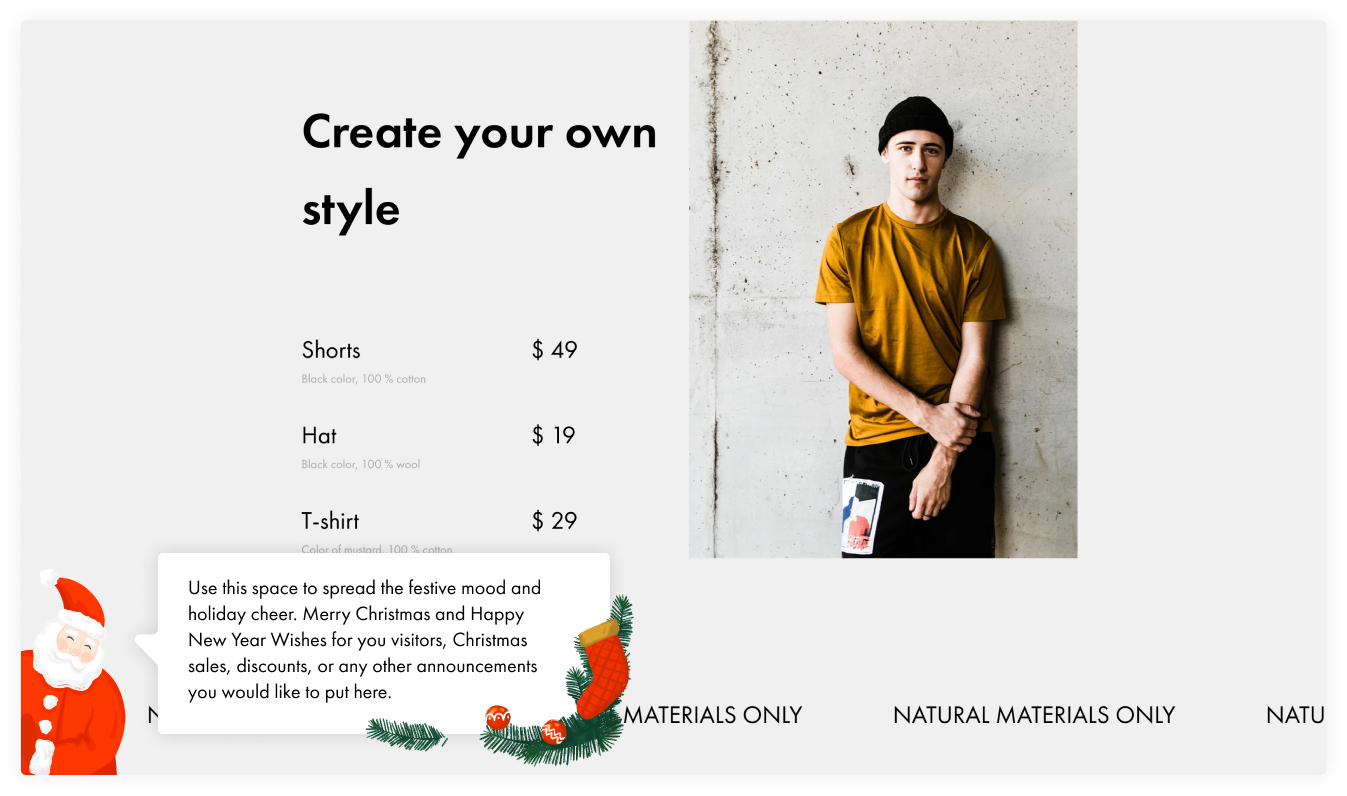 Добавьте блок на страницу и напишите тёплые поздравления с праздником или расскажите о текущих скидках на продукцию. Написать можно о чём угодно, но лучше избегать шаблонных фраз. После публикации на странице появится Дед Мороз или симпатичная коробка с подарком. Человек кликнет на иллюстрацию, прочтёт слова и почувствует вашу заботу о нём.