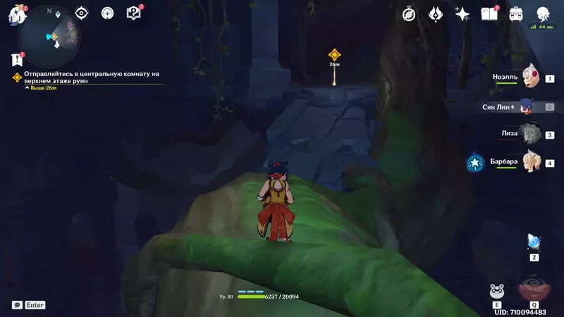 Добравшись до края, прыгайте в сторону маркера и парите на центральную башню. Долетев, вскарабкайтесь наверх и продолжайте движение к цели. Вы попадете в большую комнату — забирайтесь наверх. Справа изучите группу хиличурлов, а слева заберите каменный тайник с 10000 мора.