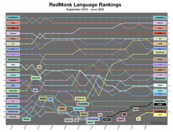 Мы видим, что наиболее устойчивой пятеркой языков за 2012-2022 гг. являются JavaScript, Python, Java, PHP и С#. И это не смотря на то, что все во всю трубят, что PHP умер еще лет 5 назад! А вот Ruby сдает позиции. Зато TypeScript быстро поднялся: возможно за счет того, что он является суперсетом языка JavaScript! Большие надежды подает Kotlin, но ему еще далеко до заветной десятки.