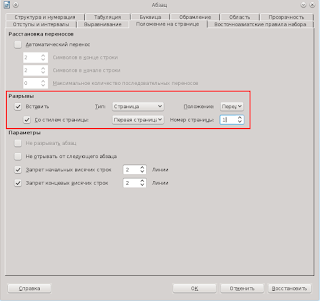 Хотел бы заметит, что в стилях абзацев есть такая же вкладка, с такими же полями, но работать она будет не совсем так как вы хотите. Нумерация будет применяться к каждому абзацу с таким стилем, кроме того, перед абзацем будет вставляться разрыв страницы. То есть, если у вас 20 абзацев Основным текстом и вы примените это способ к стилю Основной текст с началом нумерации с цифры 4, то получите 20 страниц пронумерованных цифрой 4. Однако, это может быть использовано для заголовков, когда документ имеет несколько разделов и каждый раздел должен иметь свою нумерацию. Но если вам нужно, чтобы какой-то стиль начинался всегда с новой страницы, то флажок Со стилем страницы не имеет смысла вставлять.