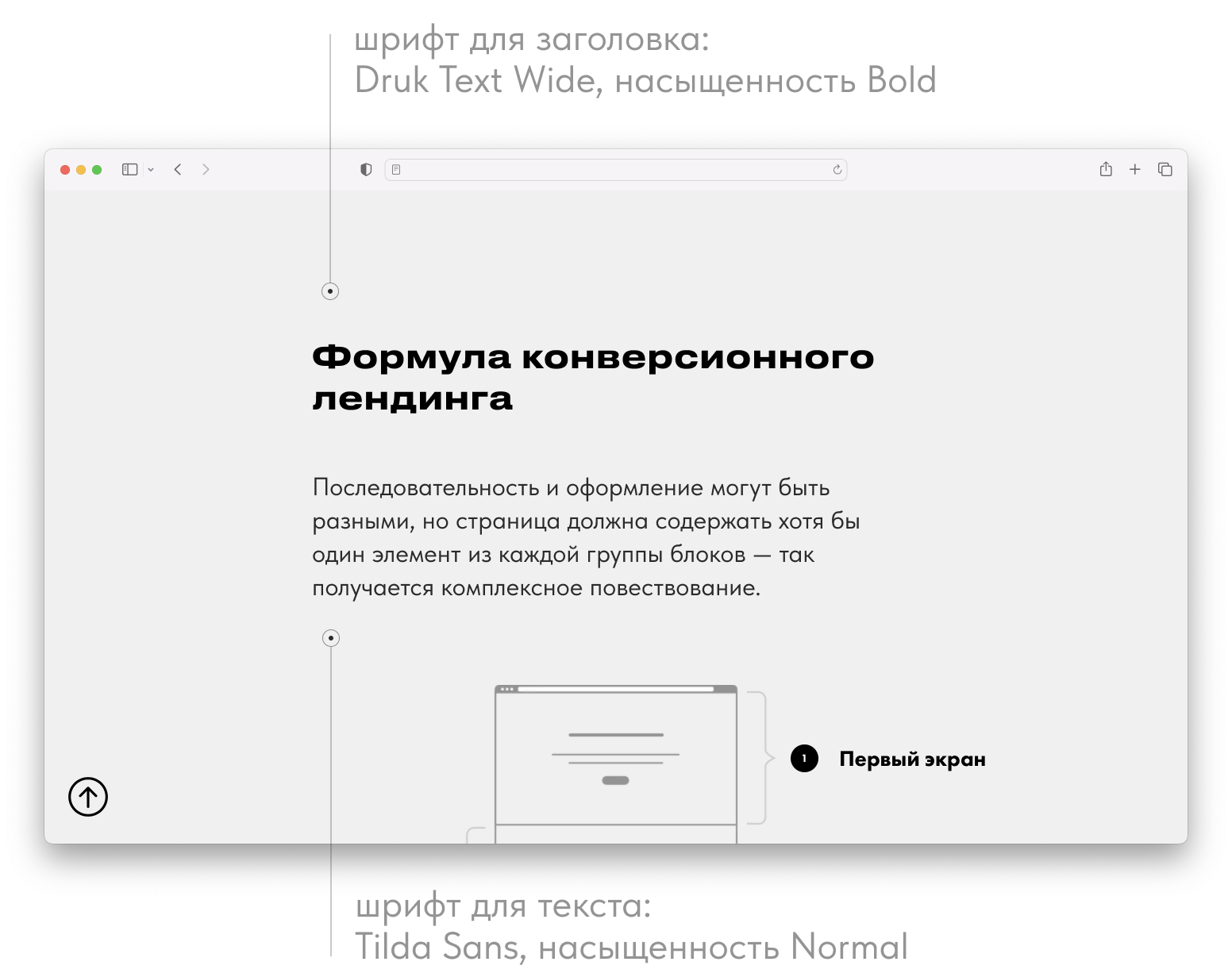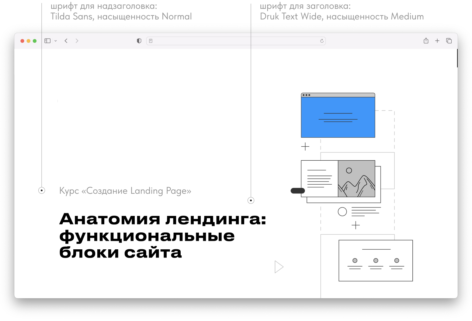 В примере используются: Druk Text Wide для заголовков и Tilda Sans для текста.