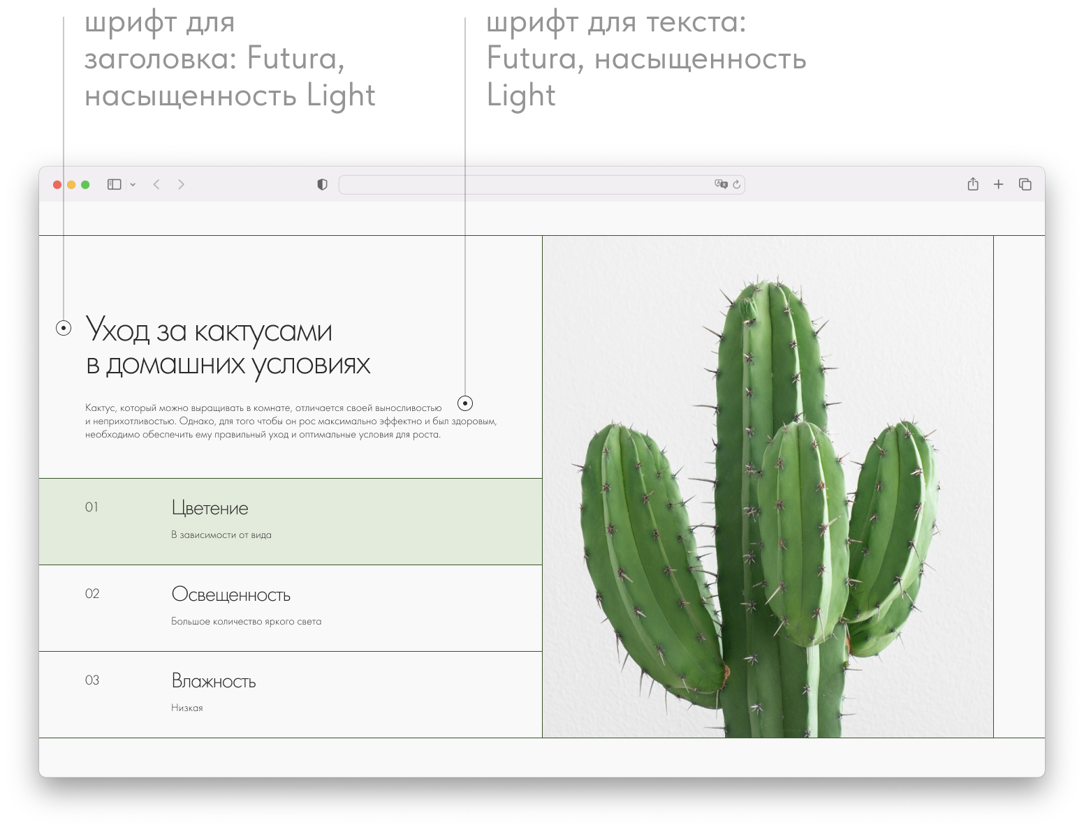 Страница сайта по уходу за растениями. В примере используется Futura.
