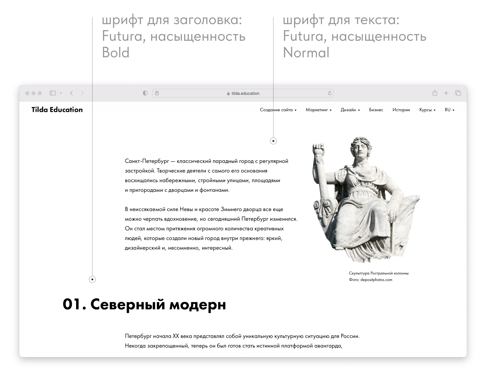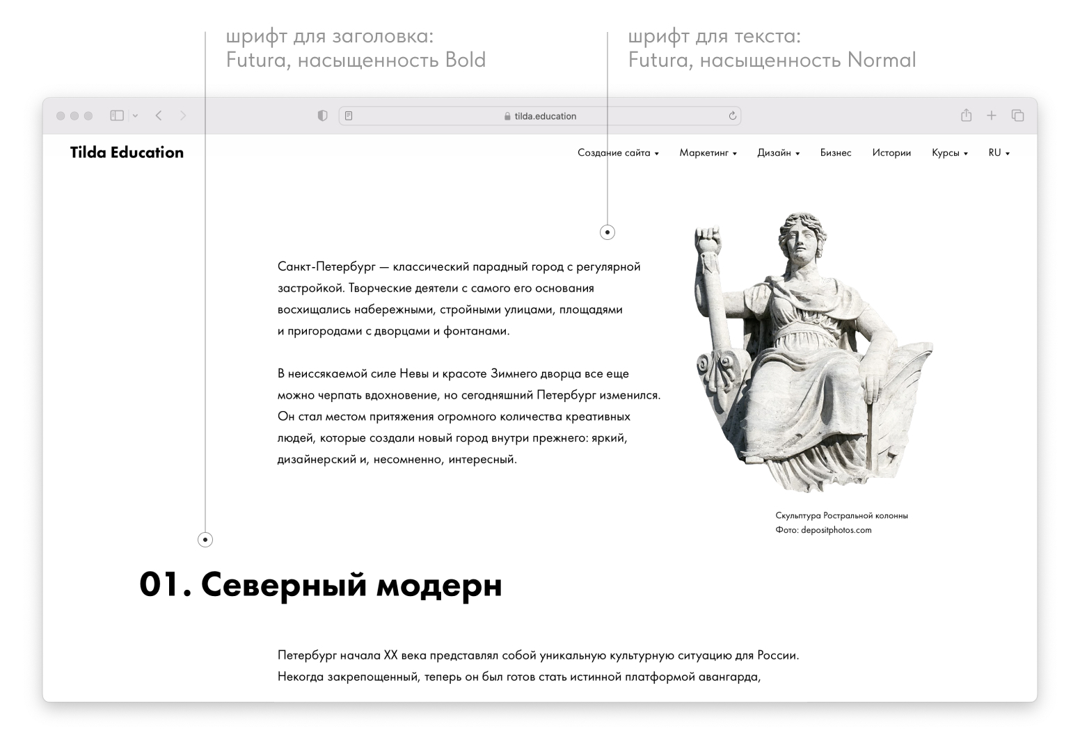 Текст статьи про Сантк-Петербург. В примере используется Futura.