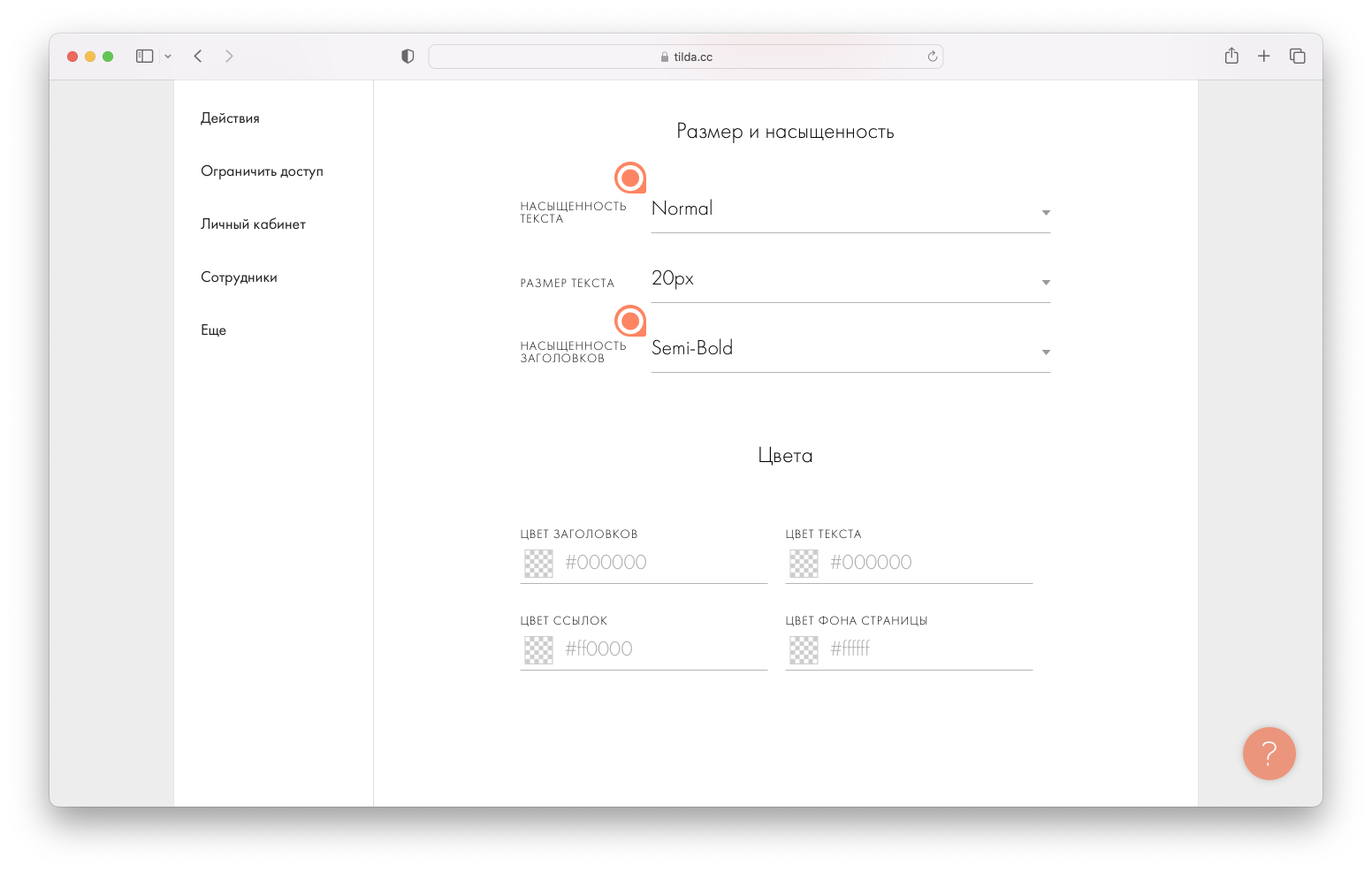 Если вы пролистаете страницу ниже, то увидите настройки размера, насыщенности и цветов текста. Параметры, которые вы укажете тут, будут применены ко всем страницам сайта. Если в каких-то отдельных блоках вам нужно будет их поменять, это можно будет сделать в редакторе для конкретного блока.