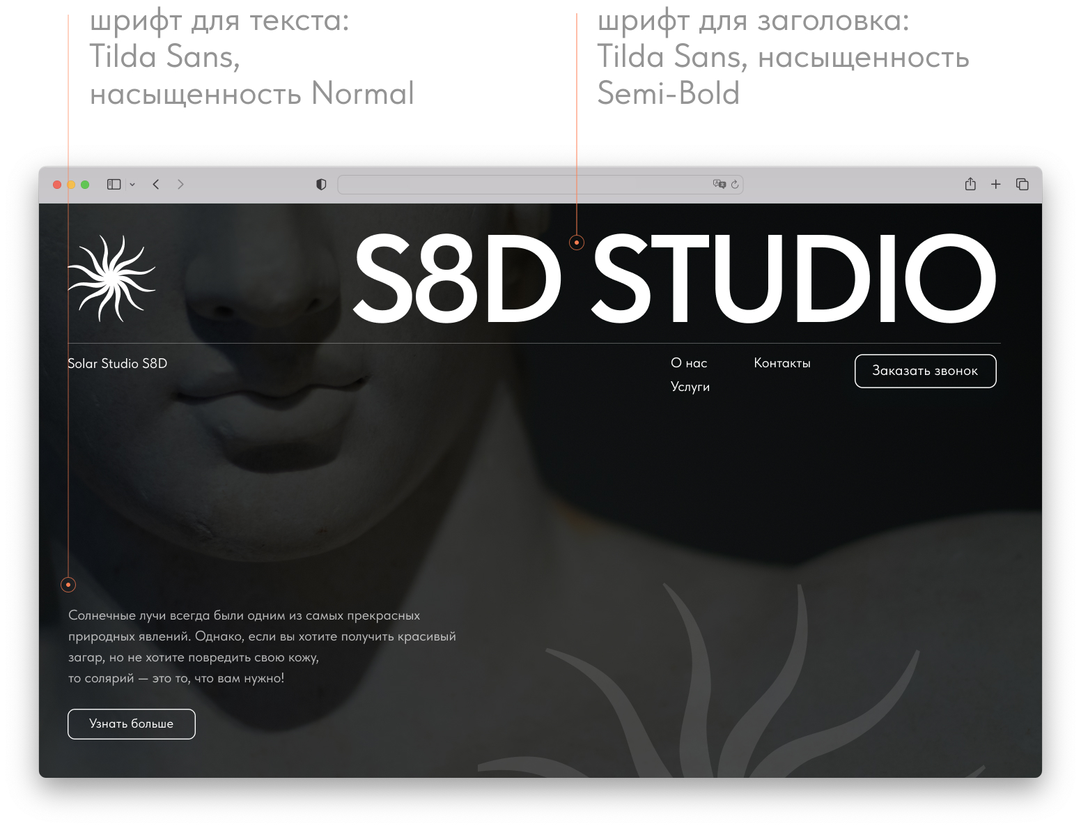 Страница студии загара. В примере используется: Tilda Sans.