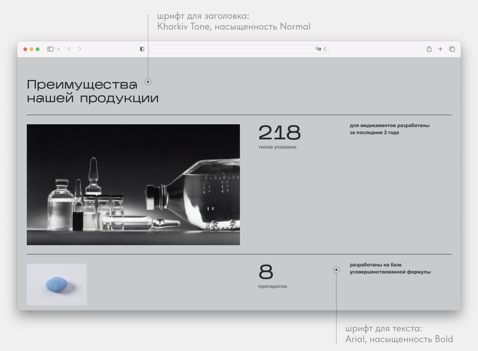 Страница сайта дизайн-бюро. В примере используются: Kharkiv Tone для заголовков и Arial для текста.