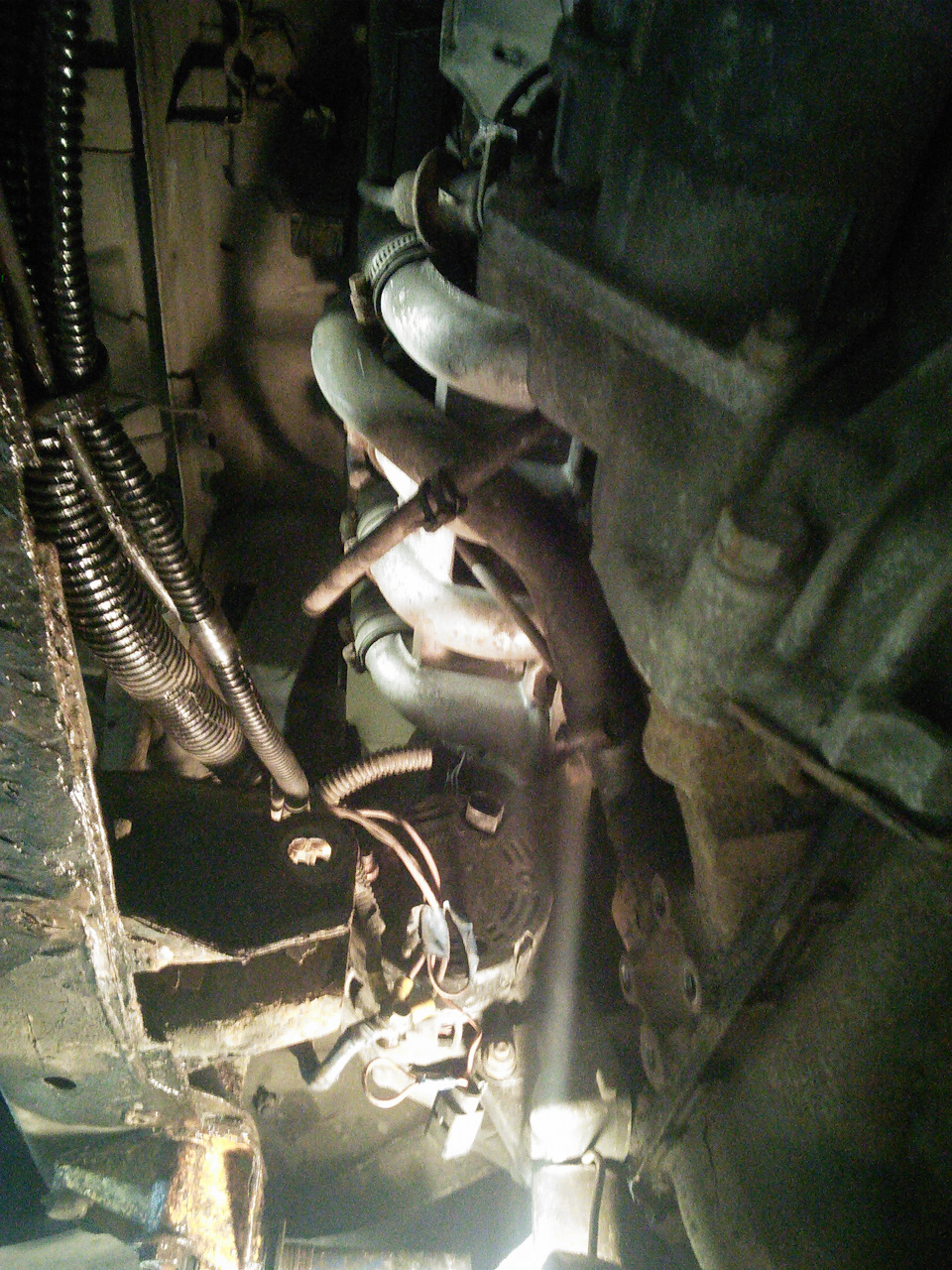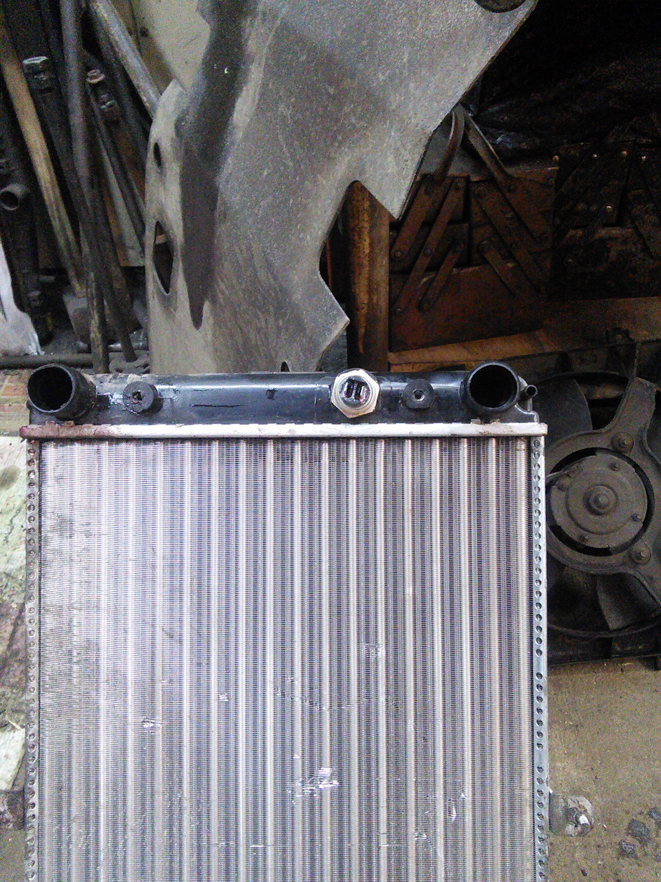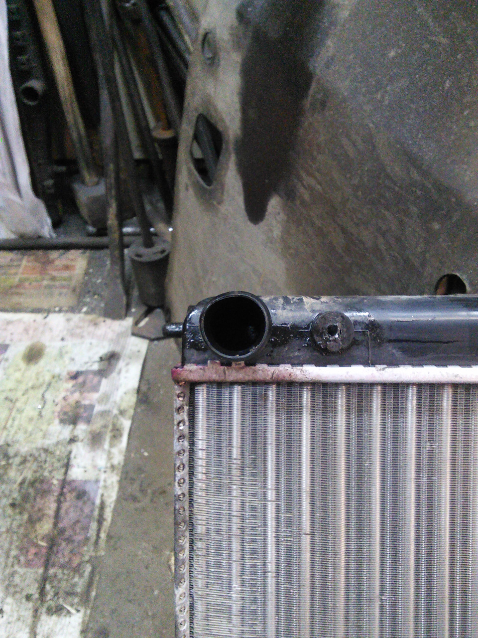 Я конечно хотел купить родной ДААЗ, но его не было в наличии, и продавец меня убедил — «Все берут, проблем нет». Я давно знаком с продукцией Лузар для ВАЗ, неоднократно ставил радиаторы Лузар клиентам, и каких либо косяков при установке замечено не было. Да и жалоб на короткую жизнь радиатора Лузар тоже не поступало или я эти жалобы пропускал мимо ушей. А вот патрубки радиатора Лузар дубовые, что каменные, и через полгода трескаются, и начинает ОЖ вытекать, поэтому патрубки на радиатор, верхний от десятки 16V и нижний я взял родные. Дополнительно были куплены 4 хомута норма. Радиатор был заменён, и я рассчитывал, что он прослужит до конца срока службы автомобиля, или до тех пор, пока я не продам машину. Но вышло иначе. В конце марта 2017 я поднял капот четырки, чтобы глянуть всё ли в порядке, и заметил следы антифриза под верхним патрубком радиатора, что меня сильно удивило. Вечером после работы, я поехал в гараж, чтобы по быстрому заменить очередной кусок отвалившейся выхлопной трубы, а заодно как следует осмотреть и выявить причину течи антифриза. Я снял защиту и пыльник двигателя, и увидел, что антифриз течёт как будто из-под заглушки отверстия для датчика включения вентилятора, которое Лузар сделал для унификации радиаторов карбюраторной десятки и инжекторной. Я попытался подтянуть заглушку, а она проворачивается — резьба сорвалась.
