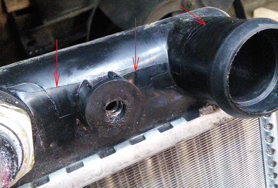 поставил пыльник двигателя и защиту на место, залил антифриз, завел машину на прогрев, а сам начал переодеваться, чтобы поехать домой, в полной уверенности, что проблема решена. Но тут я попал в просак. Как только машина прогрелась и в системе наступило рабочее давление, я увидел, что антифриз опять подтекает с бачка радиатора, хоть и в меньшей степени. Я подтянул датчик, но это не решило проблему. Протирая радиатор тряпкой и внимательно всматриваясь в место течи я увидел трещину в пластиковом бачке радиатора!