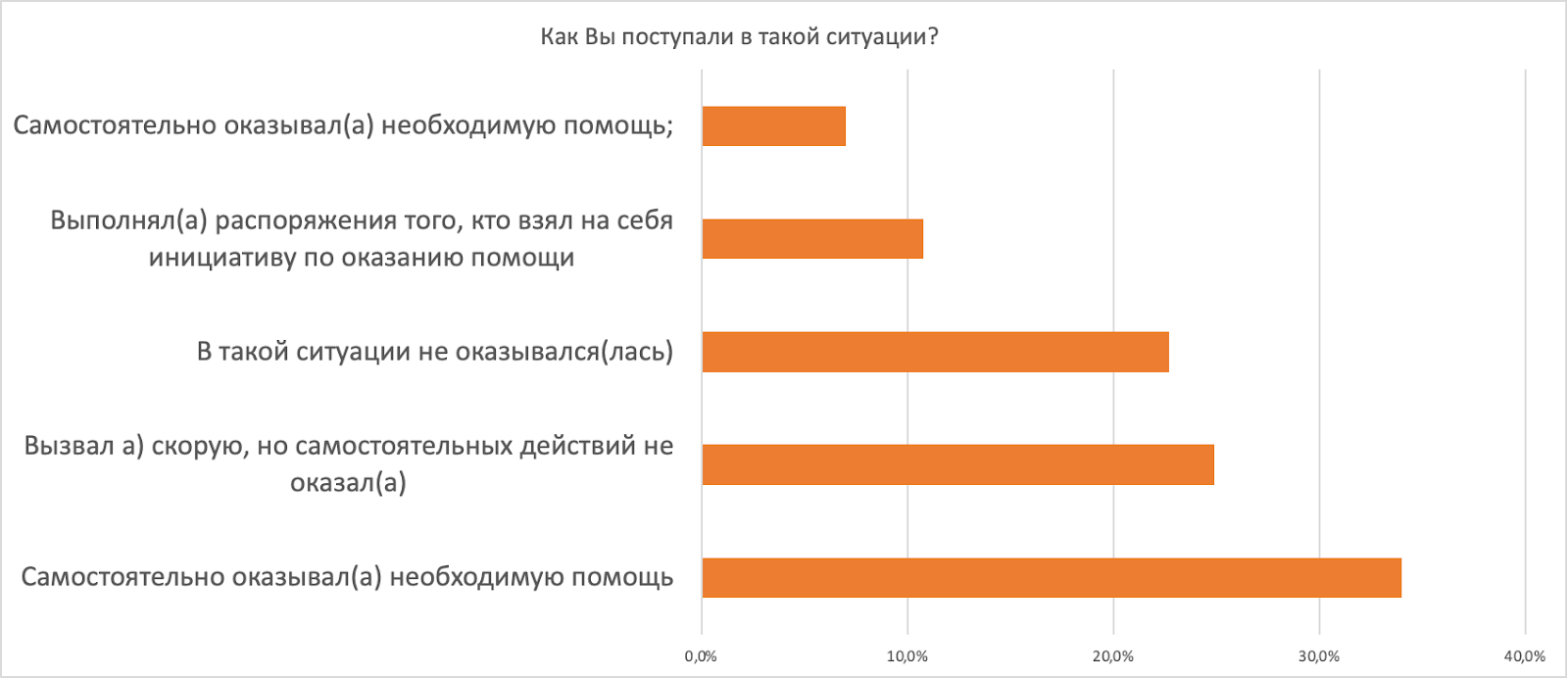 В таком случае важно начать действовать, ведь это может спасти кому-то жизнь. И 33% участников опроса самостоятельно оказали необходимую помощь. Около 25% предпочли вызвать скорую, но самостоятельных действий предпринимать не стали. Из числа респондентов только 7% наблюдали со стороны.