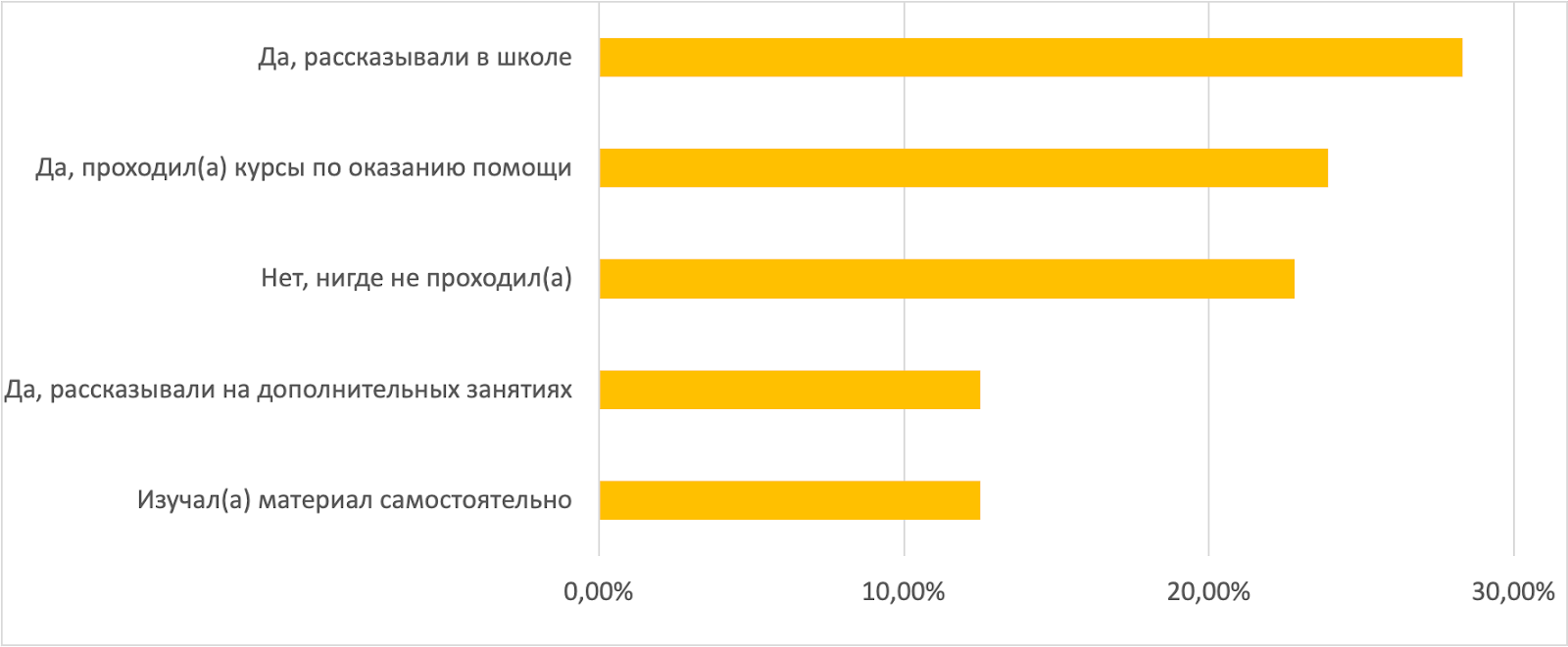 На вопрос «Проходили ли Вы где-нибудь обучение по оказанию первой неотложной доврачебной помощи?» около 28% людей говорят, что изучали некоторые основы в школе. Еще 24% проходили специальные курсы, 23% из числа респондентов нигде не проходили обучение по оказанию первой помощи.