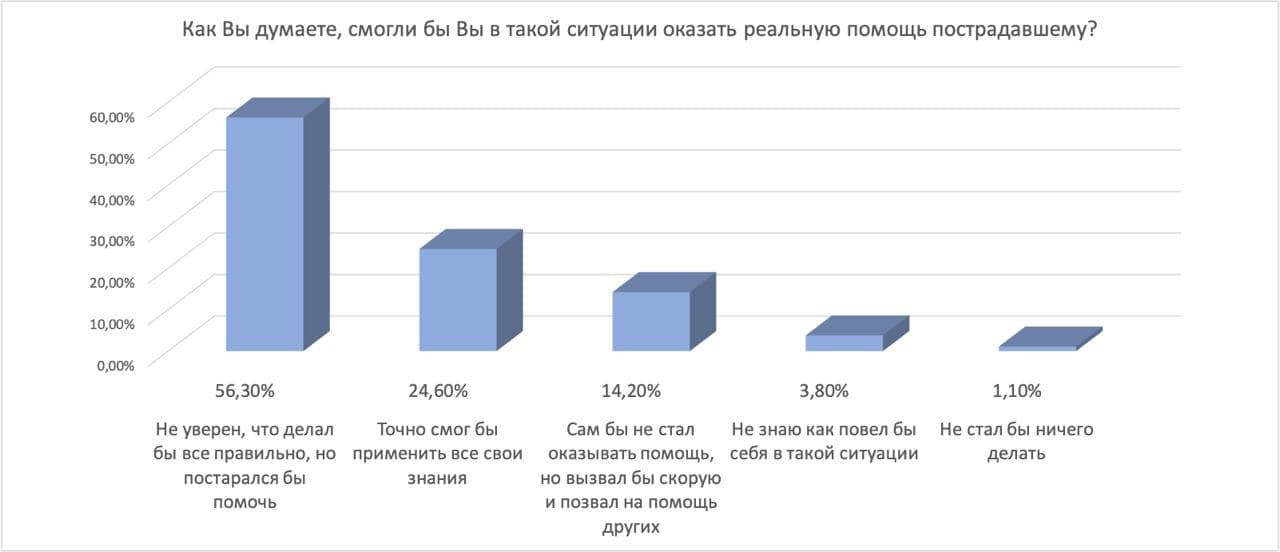 Интересно, что около 80% из числа респондентов постарались бы помочь в экстренной ситуации, в то время как 14% участников опроса не стали бы оказывать помощь лично, но вызвали бы скорую.