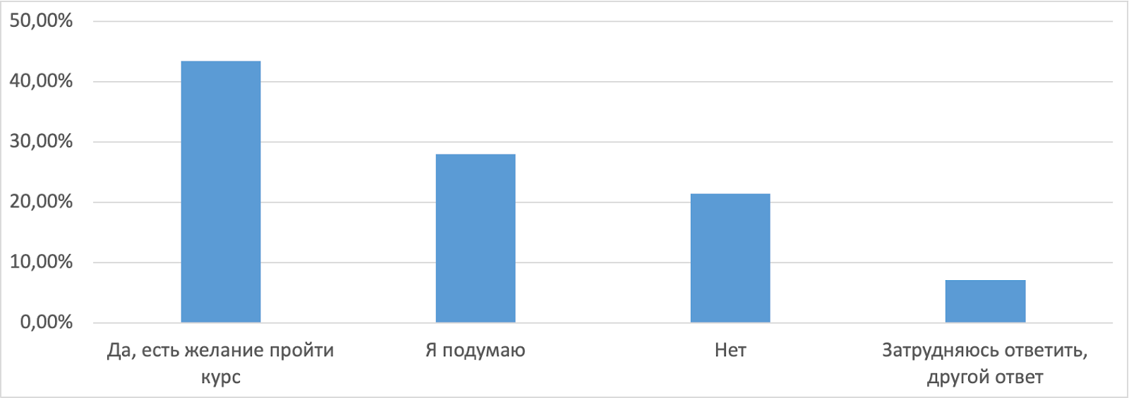 Знать основы оказания первой доврачебной помощи необходимо. И 43% из числа участников опроса хотели бы пройти онлайн-курс по оказанию первой медицинской помощи. И только 21% из числа респондентов отказались от обучения.
