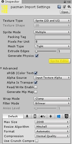 Значение «Pixel Per Unit», равное 8, означает, что 8 х 8 пикселей поместятся в одну единицу в игровом мире. Мы будем использовать это значение для всех наших текстур. Мы выбрали значение 8, потому что расстояние между двумя Pac-точками (едой) всегда равно 8 px, и мы хотим, чтобы это расстояние составляло 1 единицу в нашей игре. Мы выбрали Bottom-Left для Pivot, потому что это облегчит выравнивание.