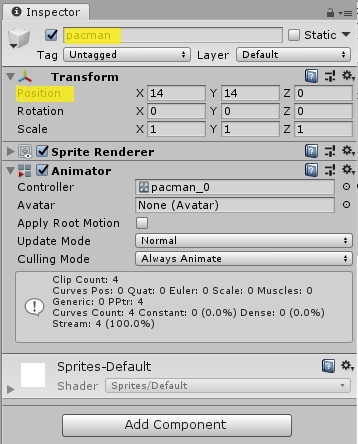 Теперь мы можем перетащить лабиринт на сцену (убедитесь чтоб вкладка была на Scene, а не на Game) или можно перетащить его в Иерархию. В Inspector меняем Position лабиринта на (0,0), чтобы в дальнейшем было проще.