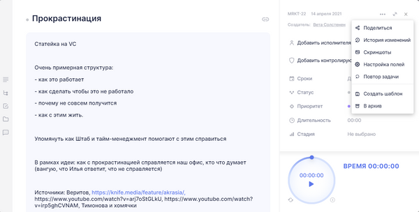 - Клик на плашку задачи открывает окно редактирования задачи. В нем можно менять ее параметры.