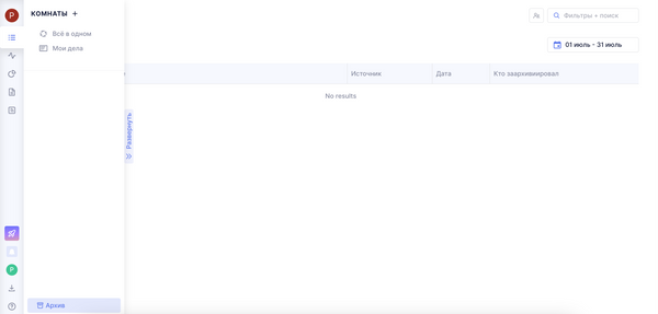 Чтобы почистить архив, выберите соответствующий значок снизу в меню выбора Комнат: