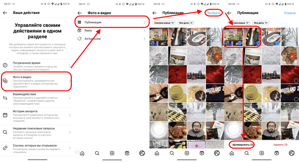 В открывшемся разделе выберите пункт Фото и видео, далее Публикации. Теперь нажмите на кнопку Выбрать и выберите все посты, которые нужно архивировать.