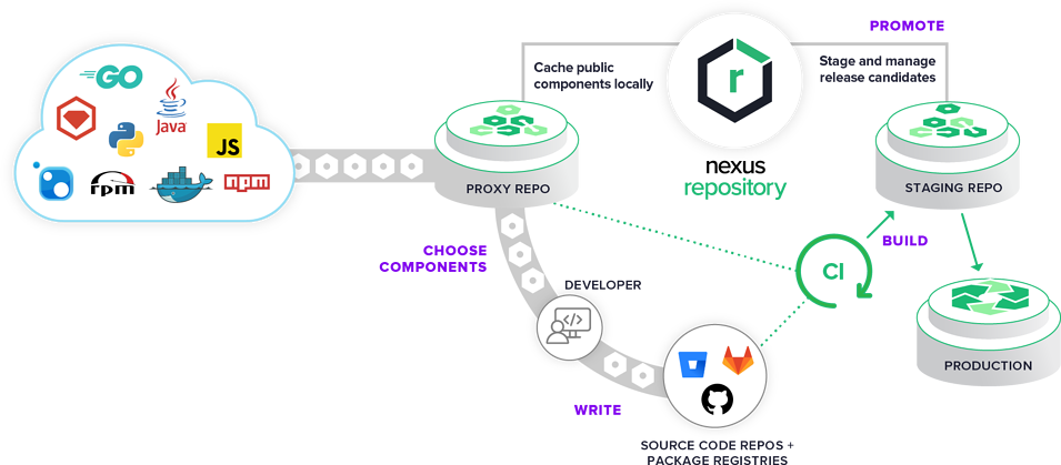 — Храните и управляйте дистрибуцией компонентов ПО Maven/Java, npm, NuGet, RubyGems, Docker, P2, OBR, APT, GO, YUM и мн. др.;