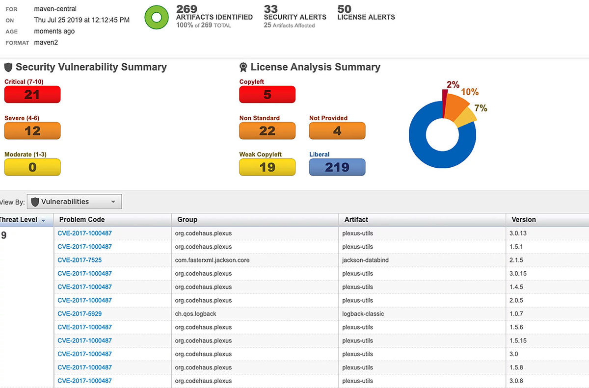 — Предотвращение общеизвестных, задекларированных уязвимостей и лицензионных рисков в компонентах Maven/Java, npm, NuGet, и PyPI;
