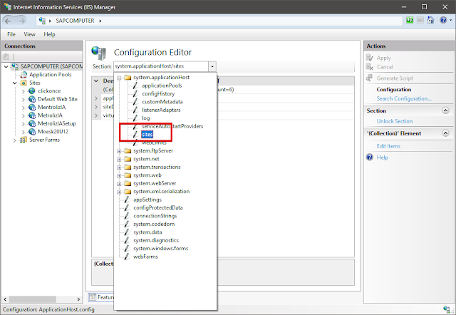 1. В разделе Section выбираем system.applicationHost/sites.