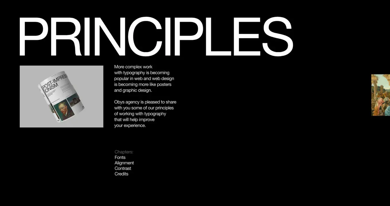 Такой прием затягивает в изучение контента и делает повествование более захватывающим. Можете самостоятельно оценить эффект на сайте дизайн-агентства Obys: