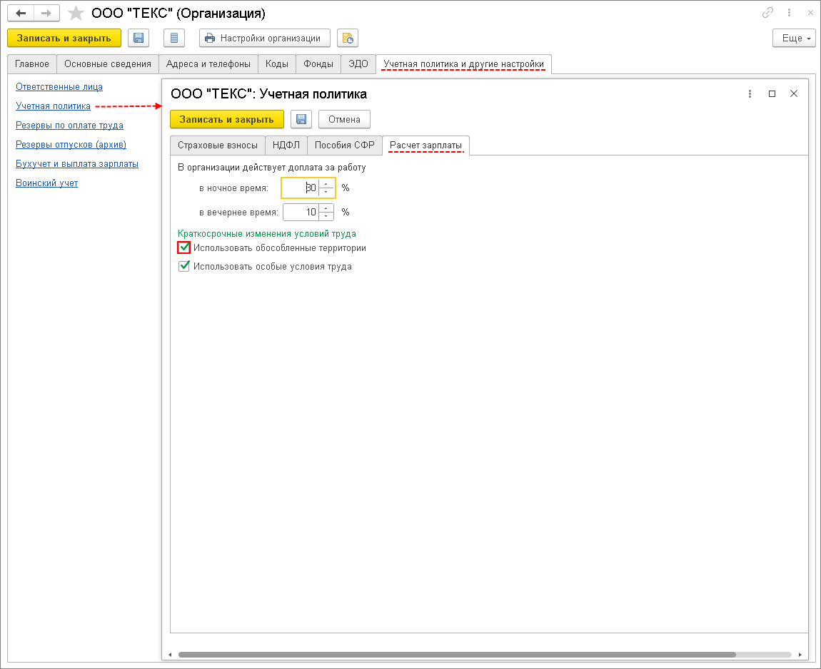 В программе можно описать территории, работу на которых необходимо отличать с той или иной целью. Учет территорий доступен, если в настройке учетной политики организации (раздел Настройка – Организации – закладка «Учетная политика и другие настройки» – ссылка «Учетная политика») в разделе «Краткосрочные изменения условий труда» установлен флажок «Использовать обособленные территории» (рис. 1).