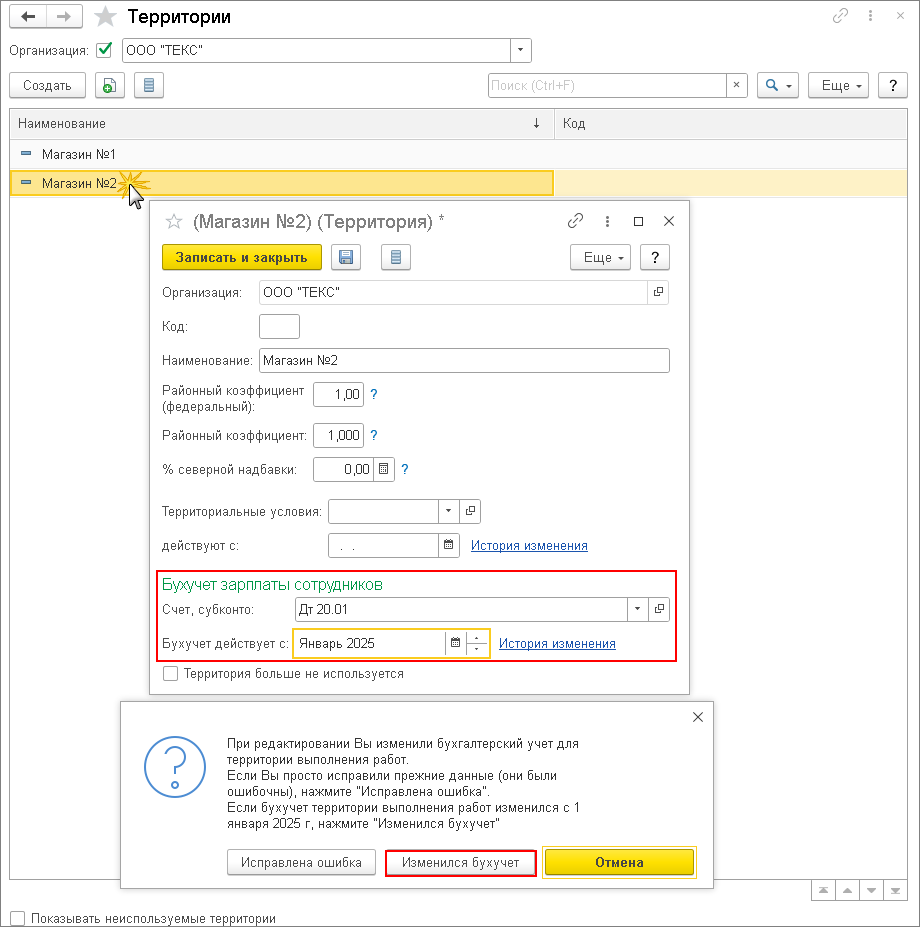 - Кнопка «Записать и закрыть». При изменении способа отражения программа выдаст сообщение о том, что при редактировании изменен бухгалтерский учет для территории выполнения рабо. Нажмите кнопку «Изменился бухучет».